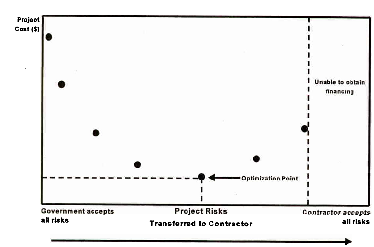 This optimization process recognizes that the costs of the project may increase as greater amounts of risks are placed on the contractor. As shown in Figure 2, shifting risk to the contractor can move the project to an optimization point where overall project costs are minimized. However, if too much risk is passed to the contractor, the contractor may not be able to obtain nonrecourse financing for the project. This constraint requires the government, the contractor, and the lenders to reach a balance of project risk assumption.