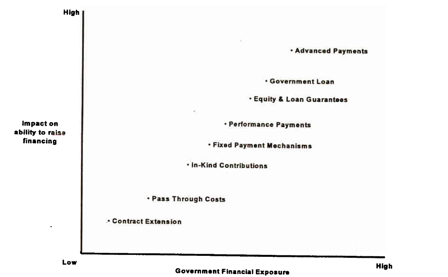 • Increased Financial Exposure: As illustrated in Figure 5 (Babbar and Fishbein 1996) and discussed in Section III, the participation of the government in a project's financing carries varying degrees of contingent liability. As the government assumes more risk or invests more money into the project, it becomes exposed to a greater share of the damages should the project fail. Therefore, the level of involvement should be strategically and uniquely suited to the needs of the project.