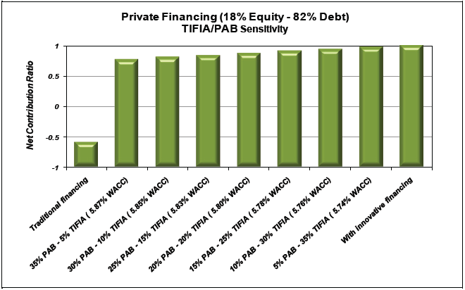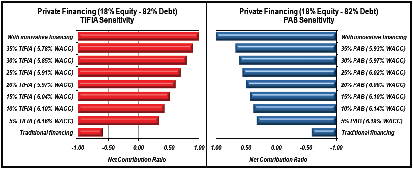 Figure 5 on the next page illustrates the potential impact of innovative financing on the net contribution ratio of PPP financing compared to traditional private financing for Project Example 7. The two charts show that progressive increases of either TIFIA or PAB financing as part of overall project financing can significantly increase the net contribution ratio. Moreover, as shown in Figure 6, also on the next page, use of TIFIA financing and PABs together increases the asset's valuation even more.