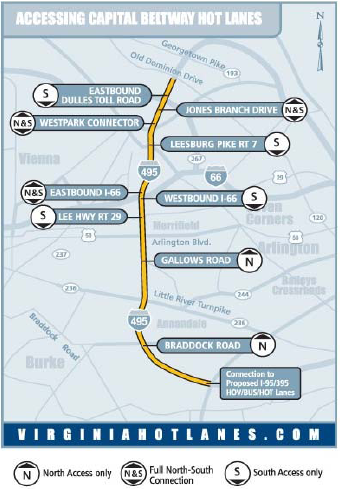 There will be several direct benefits from the HOT lanes. First, they will provide an incentive for commuters to carpool on the Beltway since presently there are no dedicated lanes akin to I-95/395 or exclusive time allowances such as on I-66. With the construction of the Beltway HOT Lanes, carpools (HOV 3+) and buses will have free access to the dedicated lanes and enjoy seven separate exit points to various destinations (see Figure 8). A second direct benefit is that as the private sector assumes many of the responsibilities involved, VDOT can devote their resources to other projects and priorities. Lastly, the four new lanes will provide drivers in Northern Virginia the option of free-flowing lanes and relief from traffic congestion. Virginia Transportation Secretary Pierce Homer, a strong advocate of the Beltway HOT lanes, recognized the potential benefits: "We are fully committed to building and funding the HOT lanes through a combination of state, federal, and private resources. We'll find a way to make this project work. It's too important to the region to do anything less."37 | Figure 8: Accessing Capital Beltway HOT Lanes