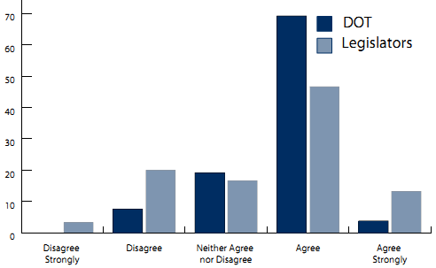 Key Survey Finding: Fewer than half of DOT officials surveyed-compared to 60 percent of legislators-disagreed with a statement that the legislative process introduces unnecessary bureaucracy or delay into transportation-related activities in their state. Note: See page 2 for a description of this survey's methodology and data limitations. The legislative process in my state introduces unnecessary bureaucracy or delay into transportation-related activities.