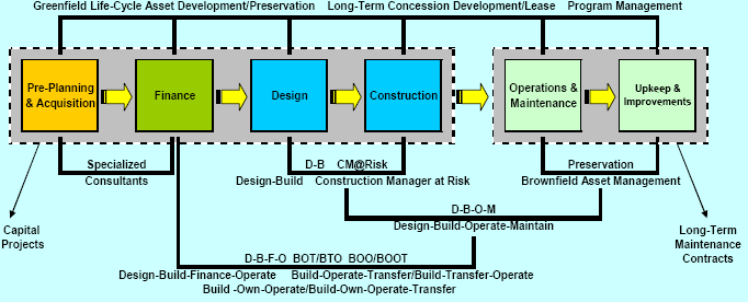 Exhibit 5 summarizes the major phases that comprise the delivery of infrastructure projects. These phases form the building blocks for alternative project delivery approaches whereby the public and private sector take responsibility to certain aspects of each phase.