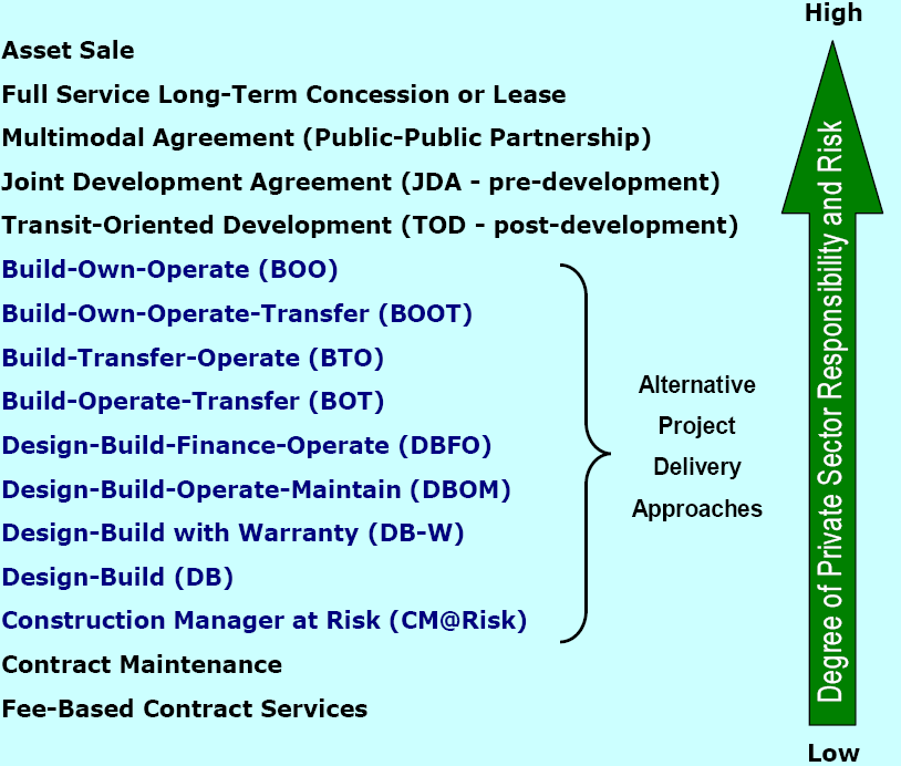 To address the inflexibility and other shortcomings of the traditional DBB project delivery approach, a number of alternative project delivery approaches have evolved over the past two decades. These alternative approaches assigned ever-increasing roles, responsibilities, and risks to private sector teams able to develop and possibly finance the project. This has helped to expedite project delivery and lower project costs through the use of best practices and avoiding the effects of inflation on the cost of project materials. These alternative project delivery approaches are part of the group of contractual relationships referred to as public-private partnerships (PPPs).