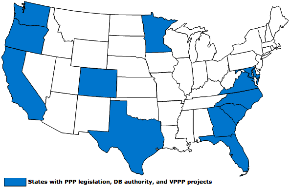 Exhibit 17 shows the twelve states actively participating in the Value Pricing Pilot Program as of the beginning of 2007 which also have enabling legislation for PPPs and design-build approaches to surface transportation project delivery. These three factors are leading indicators of state readiness for using alternative, innovative approaches to expedite their transportation programs and projects currently slowed due to a shortage of available funding.