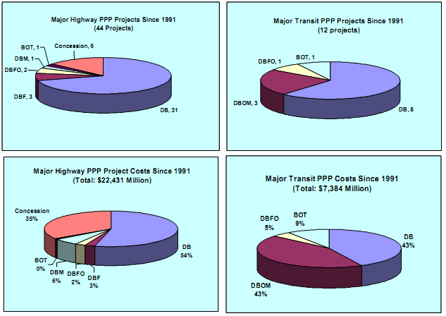 There have been 44 highway projects and 12 transit projects approved and/or completed since 1991that have used some type of PPP arrangement to expedite the financing and delivery of these projects, as shown in Exhibit 39 below.