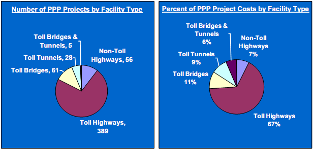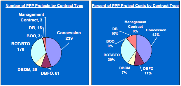 Over that 20-year period there were 539 PPP road projects planned and funded in other countries, representing $282.5 billion in project costs. The majority of PPP projects in other parts of the world have used the following delivery approaches: concession, BOT. and BTO.