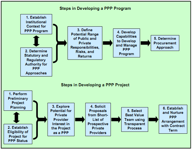 Establishing a sustainable PPP program staffed with the appropriate specialized resources capable of developing, negotiating, and administering various PPP approaches is an essential prerequisite for successfully developing and implementing a PPP project. The experience of state and local transportation agencies with functioning PPP programs and projects can be quite useful to other public agencies beginning to consider applying PPP approaches to their work programs. Exhibit 54 provides flowcharts showing the basic steps state and local transportation agencies should use to develop and implement PPP programs and individual PPP projects.