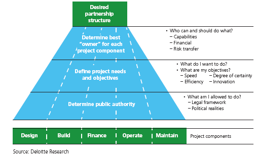 Dividing up these responsibilities in the best possible way for any given project is not easy. It requires careful qualitative and quantitative analysis. Short-cutting this process could result in suboptimal allocation and lost value. How then can public sector entities decide which project responsibilities they are best suited to retain, and which they are better off shifting to the private sector? The decision making process is depicted in the schematic (see figure 2).