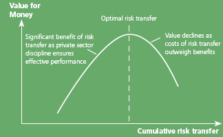 There can be a tendency in partnership structures to transfer either too much or too little risk. Because the public sector can be risk averse, with public sponsors often looking to PPPs to save up-front or total project costs, there are times when too much risk is transferred to the private sector. The result is a project that is difficult to finance, which in turn reduces the quality of partners willing to bid on it and ultimately increases costs of delivery. While the public sector must be vigilant in protecting its own interests, the point of risk transfer that will cause private partners to walk away from a deal can often be difficult to predict. Consequently, the public sector should be cognizant of the private sector's risk capacity constraints when structuring the initial bid documents, and be open to further negotiations on some items when the preferred bidder is selected. Optimal risk transfer ensures that there are enough high-quality bidders to reap the benefits of robust competition and that the public sector does not "overpay" to transfer risk that it is better suited to retain (see figure 3). Figure 3. Optimizing risk transfer to maximize Value for Money