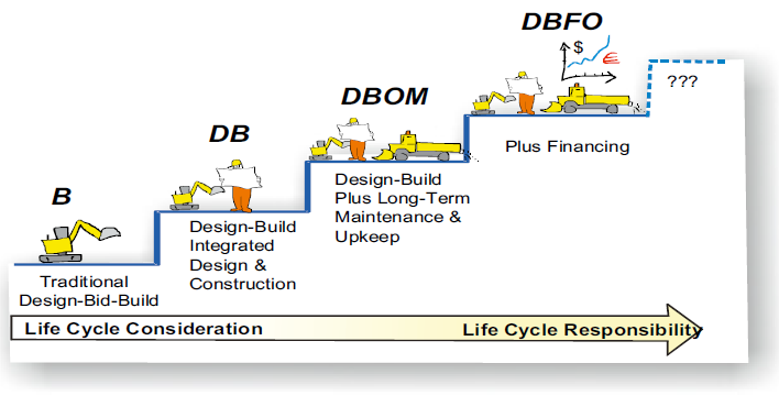 The illustration in Figure 2 shows the project delivery methods typically used for road projects and also shows the stages of progression from one model to another. Usually, it requires some form of development, research, studies, experience and etc. before moving to the next progressive model. It is easy to visually see and understand from this figure that it is quite difficult to move directly from the traditional model directly to the DBFO model. The experience of testing and implementation of any models in between can be considered as a learning process. This will help alleviate any possible difficulties and lack of experience when the DBFO model is attempted. Any valuable experiences learned from those models will make adaptation quicker and more beneficial.