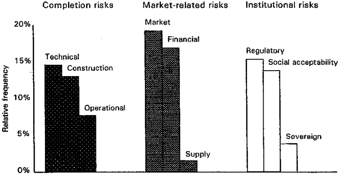 Figure 3 from Miller & Lessard (2000) displays the different types of risks that can be encountered in large construction projects. This figure shows that the greatest risks to be encountered are those from market based risks. These should be optimized in order to receive the best possible payment mechanisms so that VfM can be achieved. It is interesting to note that the next highest risk is financial. The main point is to reduce or minimize the greatest potential risks in order to achieve the overall best for any project. It is wise to consider the greatest risks first, and the lesson to be learned is that market and financial are more important than technical and construction risks. One simple choice could be to reduce market based risks altogether, and choose the availability payment mechanism.