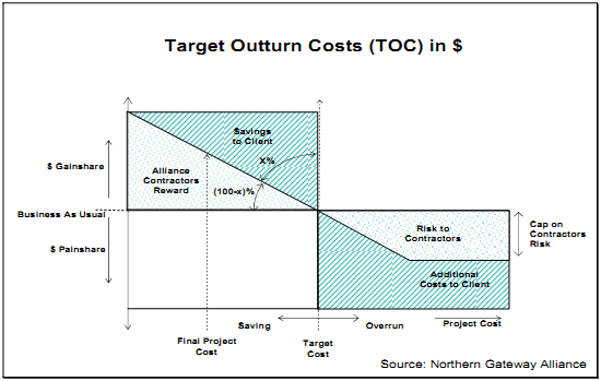 One essential aspect of the model is the "Target Price" portion. The Alliance Team brings forth the project scope, design, and planning issues until a target price can be determined. Once the target price is verified by external experts and agreed to by the alliance team, the construction portion begins to occur and progresses until project completion. Once the project is completed, the target price is verified against the actual invoices (Target Outturn Costs - TOC) for the construction portion. The so-called "pain & gain" is now determined to verify the performance of the agreement against the target price. Figure 7 shows how this is determined and how the basic calculations are performed.