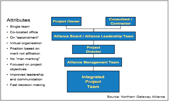 As mentioned earlier, a recent newer model has been identified as the "Alliance Model", which has been utilized for road projects. This model has been used in Victoria and Western Australia, New Zealand, and England. In England it has been termed as the "Early Contractor Involvement (ECI)" and to the best knowledge it is quite similar to the Alliance model. It is quite difficult to define the Alliancing Model in brief, and it might be easier to understand "Alliancing" by describing the features of this model. In the Alliance Model the selection of the winning alliance in the tendering process is based upon the alliance team that is best capable to bring a project to completion. In other words the alliance team is selected by 100% "Quality Criteria". The winning alliance will be able to bring the remaining portion of the client's design/planning process and develop it until a "Target Price" can be determined for the project construction. This means that the winning alliance has the obligation to complete a project from the very early design/planning phases right to project completion, and is paid all costs (including profit & overhead) up to the "Target Price" for construction. Depending upon the performance against the construction "Target Price" estimates, there can be a maximum of 15% shared bonus or shared penalty by the "Alliance Partners". Also, there is potential to receive a so called "extra bonus" for exceeding the "Key Result Areas or Indicators" (game-breaking performance), that are agreed to by the alliance. The client is also a member of the alliance team. Figure 5 shows the Northern Gateway Alliance organizational structure.