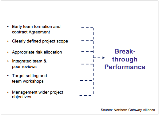 There are bonuses or potential for incentives providing that there is some type of breakthrough innovations, exceeding key performance requirements set out by the alliance, or meeting some extra special targets within the project. Some of these attributes that bring forth this so called break-through performance are highlighted in Figure 6.