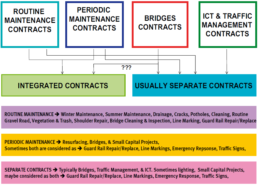 Routine maintenance can be defined by those maintenance activities that occur every year on a routine basis or of a cyclic nature. These activities may include such aspects like winter maintenance, summer maintenance, pot hole patching, minor gravel road repair or patching, minor drainage cleaning, road cleaning or sweeping, crack repair, vegetation control, cleaning (signs, bridges, roads), and trash removal. Figure 10 shows the difference between routine and periodic maintenance aspects and typical shows how they can be organized in a typical outsourced contract.