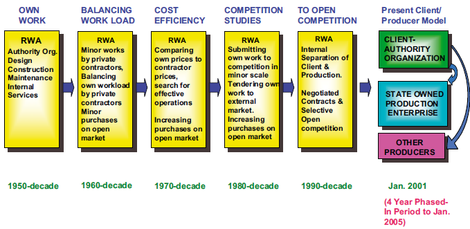 The following example from Finland will highlight the "Client/Producer model" concept and as an example of how road development has progressed and can be an example for others. Finland has quite extensively followed the "New Zealand model" of road reform and from guidance material from the "World Bank" list of recent practices. The following highlights the progression and brief history of developments in Finland.