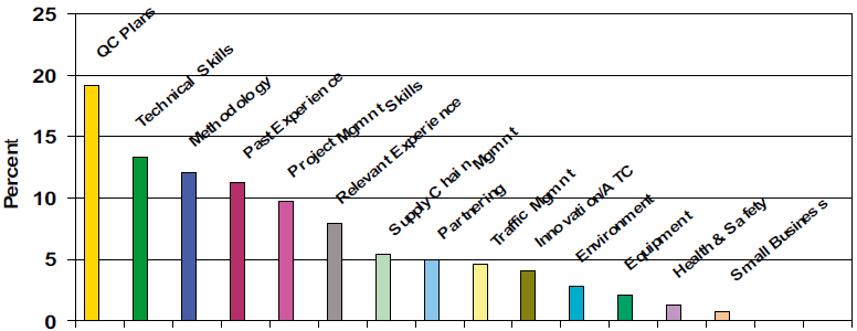 Client's perception is that the most important single issue is the QC plans that are submitted by the service provider. Then there is a significant gap to the next import factors which are technical skills, methodology, past experience, and project management skills. These top five attributes account for approximately two-thirds of the most important factors that should be determined when selecting the winner of a publicly tendered maintenance contract.