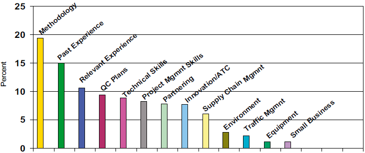 The service providers' perception is that the most important single issue is the "methodology". The service provider's main concern is to demonstrate how the plans, equipment, and strategy are to be utilized to meet the maintenance requirements stated in the contract. There is a somewhat significant gap to the next important factor which is the past experience of the service providers'. This factor is a measure of past performance of the service providers from past contracts and is seen as an important indicator by the service providers'. This factor demonstrates the accountability, trust, and performance of the service provider. This is an important observation, which makes sense to the obvious observer. However, there are very few contracts that have an interactive past experience rating system, which would affect the potential to win contracts. This may be due to labor, union issues, and the legal implications of this type of practice.