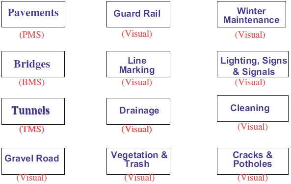 There have been good systems and maintenance management tools developed for tunnels, bridges and pavements. There are systems that are very objective and include Bridge Management Systems (BMS), Tunnel Management Systems (TMS), and Pavement Management Systems (PMS). These are periodic maintenance aspects that typically are tendered via separate contracts.