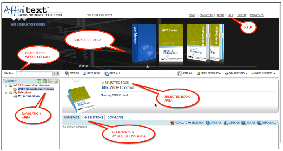 - The Bookshelf Area: showing all the Folders / Books in a category (you project documents are called Books in the Library / Folders represent the different categories of documents in the Library)