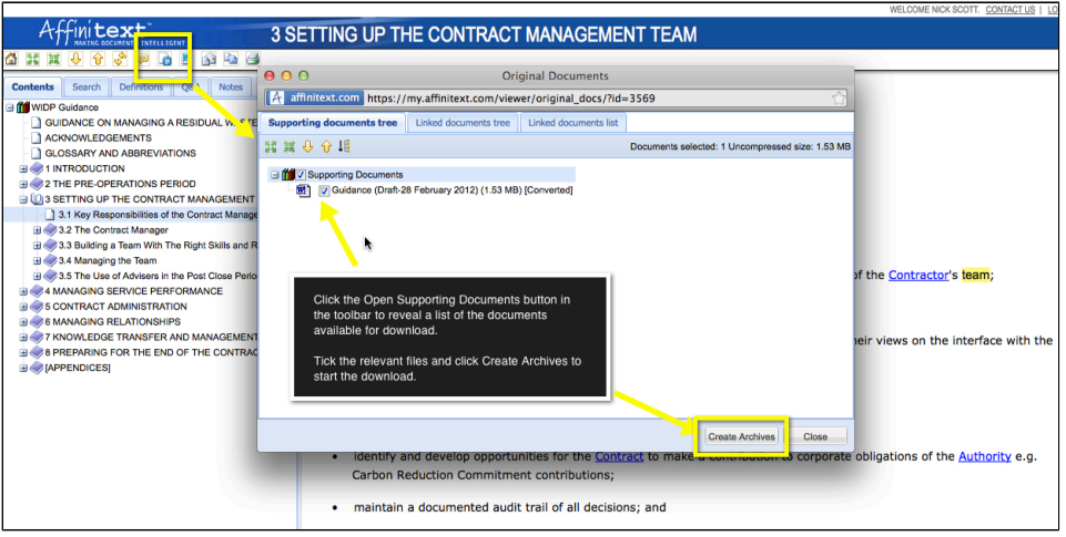 Affinitext stores all the original documents for the WIDP Consultation Library as editable Word files. You can access and download these documents via the Supporting Documents button in a Book. Once you have downloaded a copy of the original Word document you will be able to print the document in its entirety.