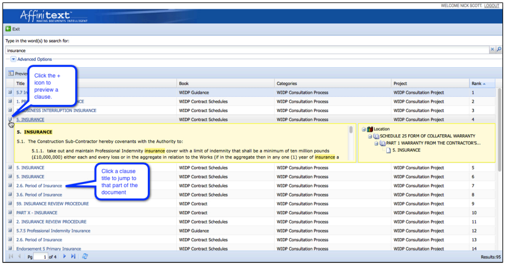 The Library Search window lists all the pages that contain the search terms, the book the page is in, the category and the project the book is in.