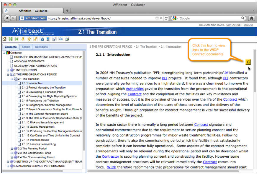 Click on the yellow Contract ("C") icons to display a pop-up containing links to the relevant guidance sections.