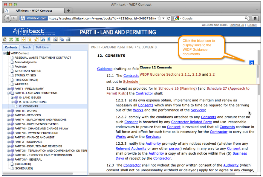 Click on a blue Guidance ("G") icon to display a list of links back into the WIDP Contract documents.