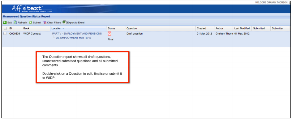 The Question Report includes all draft questions, unanswered submitted questions, and all submitted comments. From here you can also edit, review, finalise and submit your questions to WIDP: