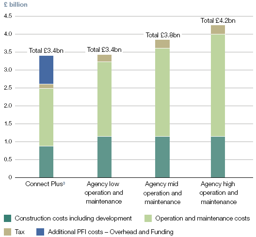 • The present value of the Agency's lowest estimate of operation and maintenance costs was £0.4 billion higher than Connect Plus's equivalent costs in its final bid. We consider that there should have been scope for reducing the Agency's estimate of these costs under conventional procurement as the market was becoming more competitive in the economic downturn of 2009. In addition, in pricing the contract when its financing costs rose in the credit crisis, Connect Plus built in conservative assumptions for maintenance costs over the full 30 years of the contract. The Agency considers, however, that renewing conventional maintenance contracts every five years would lose efficiencies which a single contractor can deliver over 30 years.