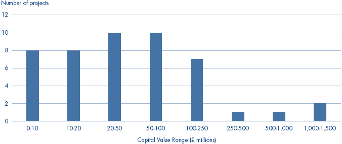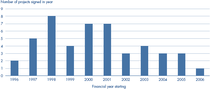 NOTES 1 The contract end date is calculated from the date that the service provided under the contract becomes fully operational. 2 Survey returns were not received from these project despite the intervention of the Department's PFU. 3 Information not available from the Ministry of Defence. 4 Part of this project is off balance sheet. 5 A survey was not sent to these projects as the contracts were being subsumed into another contract at the time of our study. 6 Actual not available, contractual target was five months after contract signature. |