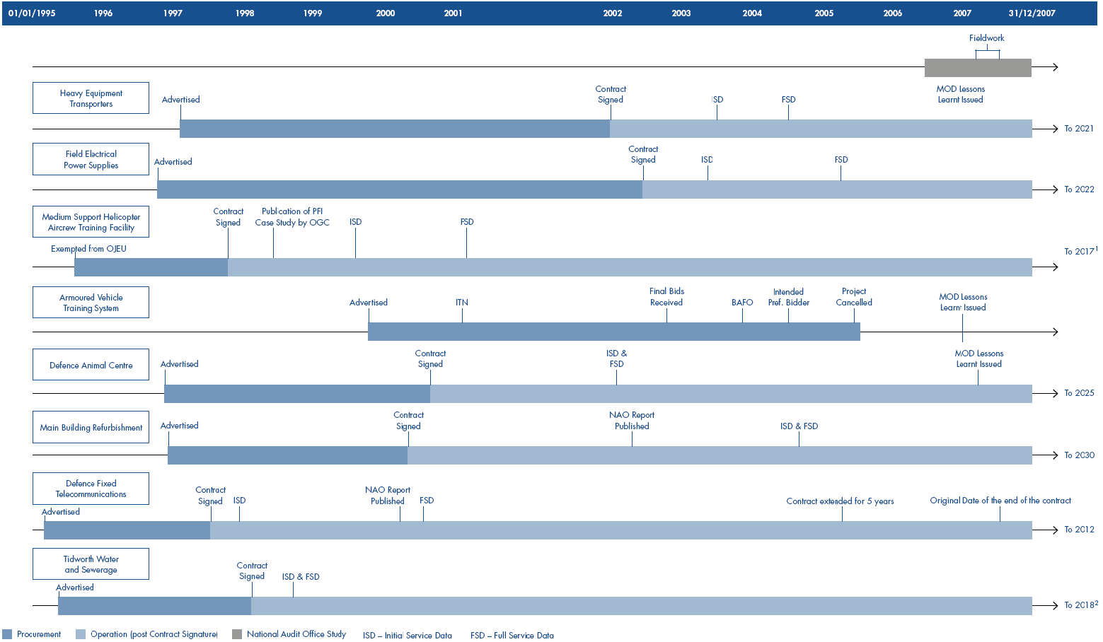3 The eight case study projects also spent varying amounts of time in procurement. All the operational contracts will run until at least 2012 and, in the case of the Medium Support Helicopter Aircrew Training facility may run until 2037.