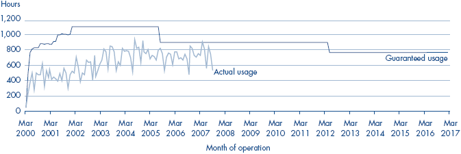 30 A level of usage, equivalent to 80 per cent of the facility's capacity, is guaranteed to the contractor across the first 20 years of the contract. Actual usage of the facility has been, and is currently, lower than the level that is guaranteed to the contractor. Overall usage over the in-service phase to December 2007 has been 64 per cent of the level guaranteed in the contract, with 34,000 unused hours. The Department has contracted and therefore paid for capacity that it has not subsequently needed. Expected usage included Chinook Mk3 training, but that aircraft has still to be introduced to service. However usage is increasing; in 2007 usage was 84 per cent of the guaranteed level and in the later stages of the contract it may exceed the guaranteed level. This would result in the Department having to buy additional hours' usage at a cost of at least £250 per hour. In such cases, the Department will need to ensure that usage of the service is optimised in the remaining period of the contract and that the project team is working actively with the contractor to ensure that this happens.