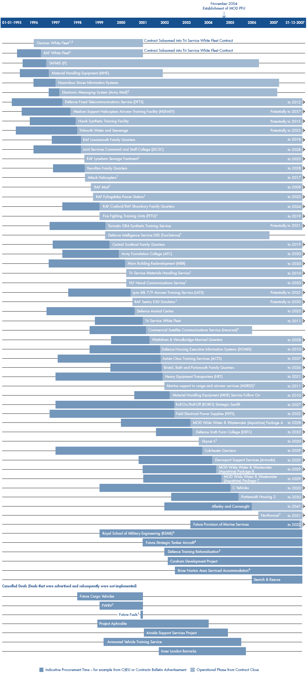 NOTES 1 The date of advertisement in the OJEU or the Contracts Bulletin could not be provided by the Ministry of Defence. 2 These projects were novated to other contracts. 3 Now being procured as a PPP contract. 4 Signed in March 2008. 5 One of the two PFI training packages of the Defence Training Rationalisation Project has been cancelled and alternative procurement options are being considered. 6 This project has been re-started. 7 Future Wheeled Recovery Vehicle. |