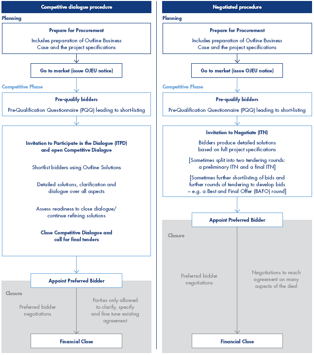 1.5 The procurement of goods and services by public authorities in the UK is governed by European Union Directives, designed to promote and encourage transparent and fair competition between contractors in EU member states. Changes to these Directives have been implemented in UK law from 31 January 2006. Prominent among the changes is the new procurement procedure of Competitive Dialogue for complex projects, such as PFI deals (Figure 3).