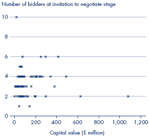 2.6 As Figure 6 overleaf indicates, the number of developed bids received by procuring authorities has been unrelated to the size of the projects being procured. Larger deals have been as likely to receive relatively few developed bids as smaller deals.12