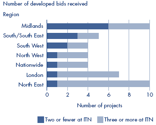 2.12 Figure 7 indicates that, with very few exceptions, projects that reached financial close in the two years up to May 2006 and which were tendered in London, the North West and North East had three or more bidders at the invitation to negotiate (ITN) stage. More than half the projects tendered elsewhere in England during that period were down to two bidders at ITN.14