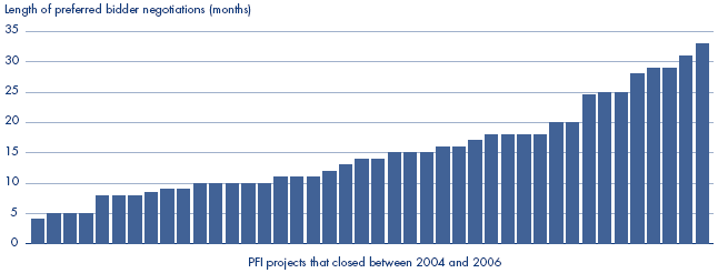 3.5 Prior to 2004, around half of PFI projects involved preferred bidder negotiations of a year or more. Between 2004 and 2006, two-thirds of PFI projects had preferred bidder negotiations lasting a year or more, and the average length of preferred bidder negotiations for all projects that closed during that period was 15 months (see Figure 9). This is twice as long as Authorities expected when they selected a preferred bidder. On average, negotiations with a preferred bidder took almost as long as the competitive phase that preceded it.