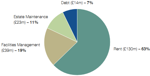 1.4 In 2008-09 the Department paid Mapeley £206 million for rent, facilities management, estate maintenance, and debt charges (Figure 3). This includes a proportion recharged to the Valuation Office Agency and other occupiers. £157 million related to estate occupied by the Department, representing about 35 per cent of its total estate costs of £450 million. By the end of 2008-09 the total cost was £1.88 billion (2009 prices), £312 million (20 per cent) more than the contract model price. Figure 4 overleaf shows the reasons for the increase.