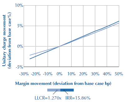The diagram shows how the unitary payment changes as the bond margin moves. The two lines in the graph represent two key project indicators (loan life cover ratio and internal rate of return) that were held constant while the bond margin was flexed. The base case scenario (where the two lines meet) is the actual negotiated deal. A more detailed explanation of the methodology for deriving this graph is at appendix 3.