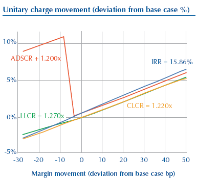 The lines cross, indicating which of the four ratios is actually responsible for determining pricing varies depending on the bond margin. Whichever of the lines is uppermost, at any given bond margin, determines the change in Unitary Charge needed to preserve the ratios. This analysis considers four ratios, and as the graph shows, the iso-IRR, iso-LLCR and iso-CLCR traces move roughly linearly with the movements in bond margin. The equivalent for ADSCR does so too, with the exception of a dog leg occurring when the margin falls just lower than the base case.