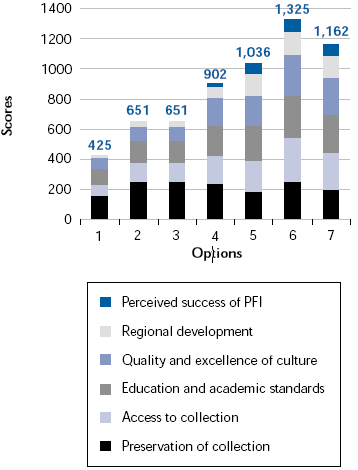 1.84 Although Option 6 was not the cheapest alternative, both the Armouries and the Department considered that there were other principles in addition to financial considerations when managing a museum. The Armouries therefore, at the same time as its financial appraisal, also evaluated the options against non-financial criteria, in line with Treasury guidance on options appraisal. These criteria included compliance with the Armouries' own statutory duties as well as compliance with the Department's new objectives for the project - securing the regeneration benefits arising from the redevelopment of Clarence Dock and securing the reputation of the PFI. This analysis showed that Option 6 best met these non-financial criteria (Figure 12). The museum would remain open and the positive impact of the museum on the local economy and the Clarence Dock development would continue.