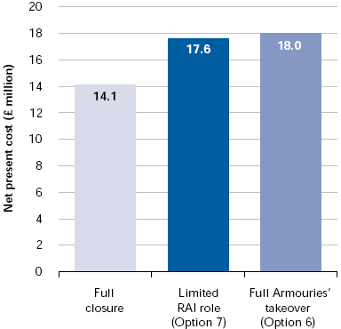 1.87 Secondly, the Department considered that the new option (Option 7) offered better value for money. It estimated that the option was marginally cheaper than the Armouries' preferred option, while offering a similar level of non-financial benefits (Figure 13). Under the Armouries' calculations, Option 6 had been less expensive than Option 7 (Figure 12) as, although the Armouries had assumed that it would need to pay rent to RAI in order to get speedy access to the museum, it had not quantified this payment since the payment had yet to be negotiated. The Department therefore assumed in its calculations that, under the Armouries' preferred option, the public sector would be asked to pay as rent the annual cost of £900,000 of servicing the existing RAI debt in full. For its part the Armouries considered that the maximum rent that it could afford to pay was likely to be insufficient to pay off the outstanding debt.