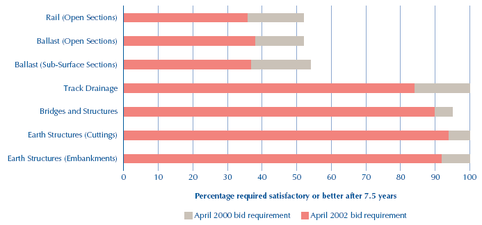 NOTE LU classify asset conditions on a scale of A-E, where A, B and C are satisfactory or better; D means heavy maintenance or replacement/ overhaul is needed; and E requires frequent inspection or removal from service until fixed. This figure shows, for different asset types, the PPP bid requirement for the proportion to be made satisfactory (condition A-C) within 7.5 years in April 2000 and April 2002. The variations depend on the underlying baseline: for example, 85-90% of drainage assets were classed as A, B or C in shadow running years. Grey assets (see glossary) are provisionally classed as satisfactory unless engineering judgement indicated otherwise. Source: London Underground |