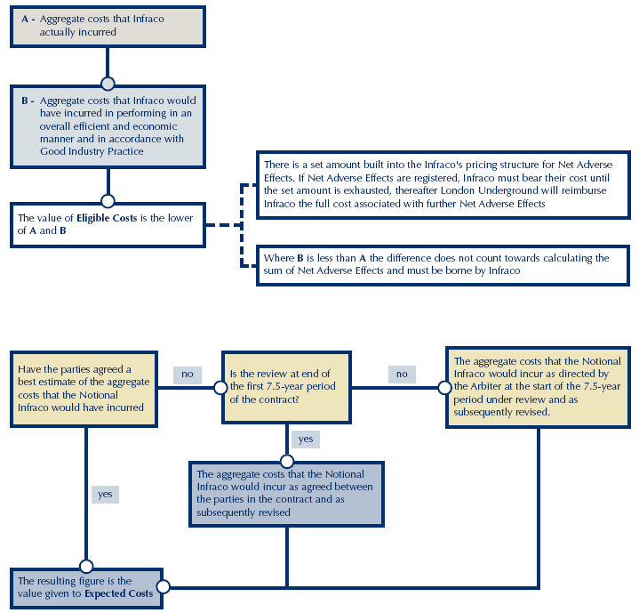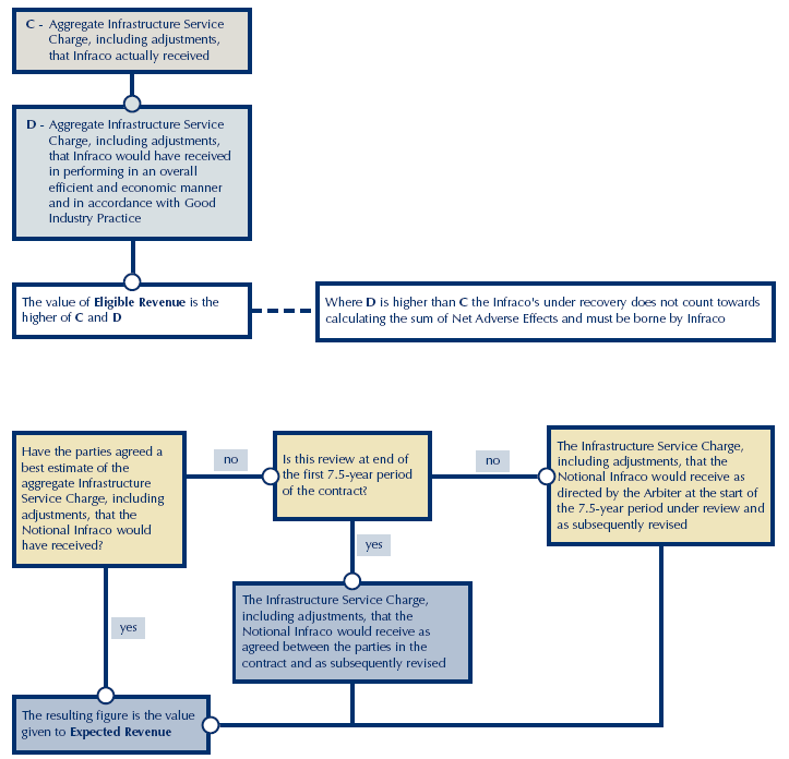 3 Provided that they act in an overall economic and efficient manner, the Infracos are entitled to limit their exposure to adverse changes in expected costs or expected revenues. The way this is done is by comparing actual expenditure or revenue with the expenditure or revenue that a notional economic and efficient infraco would have spent or received in similar circumstances. Figure 2.3 (a to c) overleaf sets out the contract provisions that govern this relief. Either party may appeal to the Arbiter in the case of disagreement.