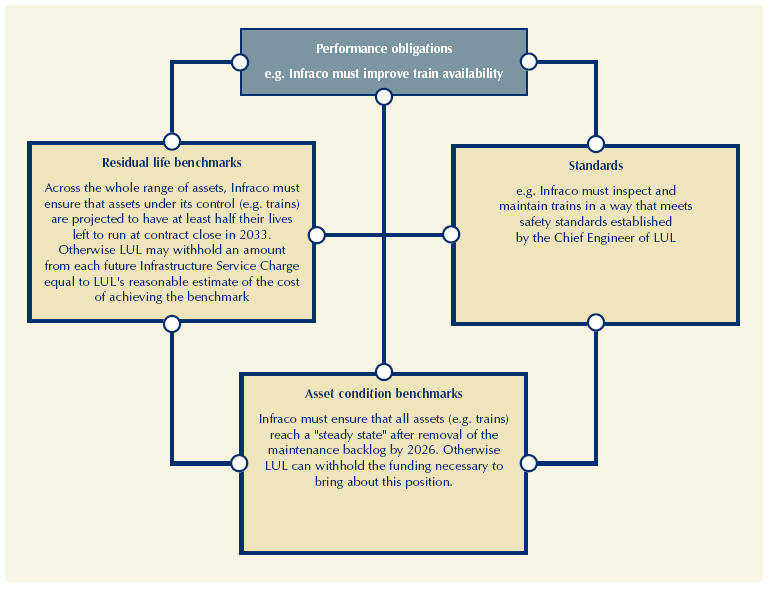 2 London Underground sought to incentivise the Infracos to bring about improvements to the Tube's infrastructure and, consequently, passenger service through a combination of contractual conditions: performance obligations, standards, asset condition benchmarks and residual life benchmarks (Figure 2.1). Under private ownership, the Infracos have the whole life ownership responsibility to maintain and upgrade the track, tunnels, signals, stations, lifts, escalators and trains under 30 year contracts to London Underground. After the contract period the upgraded assets will return to the public sector. The measures are further defined below:
