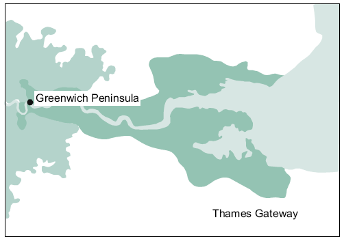 The Greenwich Peninsula is located in East London and is in a major regeneration area, the Thames Gateway