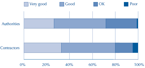 9 Our survey showed that 72 per cent of authorities and 80 per cent of contractors view their relationship as being good or very good. Very few (1 per cent of authorities and 4 per cent of contractors) consider that their relationship is poor (Figure 2). Some 45 per cent of authorities and 35 per cent of contractors said that their relationship had improved since contract letting. A much smaller number (18 per cent of authorities and 11 per cent of contractors) said that their relationship had worsened. These results suggest that authorities and contractors are making efforts to maintain a good relationship but that in a number of cases there is work to be done to improve relationships.