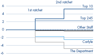 2.19 The potential return was linked to the growth in value of the equity of the company at the flotation. The performance ratchets amplified the returns of the top 245and top 10 managers, acting as an additional incentive on management to increase the value of the company. To meet the first ratchet the value of the Department's and Carlyle's equity investment needed to increase by more than three times by the flotation. The second ratchet could only be triggered if the value of the equity increased by more than four times. If the equity value of QinetiQ failed to increase by 1.2 times by the flotation the staff who had invested in ordinary equity - the top 245 and top 10 managers - would have lost their investment. Furthermore the top 245 and top 10 managers could be requested to sell their shares for the lower of the purchase price and the prevailing market value, as determined by the Board, if they left voluntarily or were dismissed from the company before a flotation. Figure 6 sets out the impact of the ratchets on the shareholdings of staff, the top managers, the Department and Carlyle; the full criteria for the operation of the ratchets are described in Appendix 4.