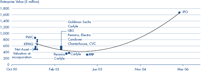 2.22 Soon after incorporation in July 2001, the value of QinetiQ had been appraised jointly by KPMG and PricewaterhouseCoopers (PwC). The report, prepared by KPMG, gave KPMG's initial judgement of the value of the business as in the range of £551-£571 million. The report also referred to PwC's initial view that a value of £862 million was more realistic. PwC do not now have the inputs and assumptions supporting that figure and are therefore unable to confirm its robustness or comparability with other valuations. In August 2001 the Department requested that PwC halt the joint valuation work and instead carry out a review of KPMG's valuation, which had by this time changed to between £467-£649 million. PwC suggested that KPMG's revised valuation was low and that there was strong evidence that it could be increased by £170-£250 million based on the market value of land and buildings owned by QinetiQ, which had not been valued by KPMG as part of their work. Following due diligence, Carlyle, in their bid dated August 2002, valued the business at £374 million (paragraph 2.24). The range of historical valuations is shown in Figure 7 overleaf.